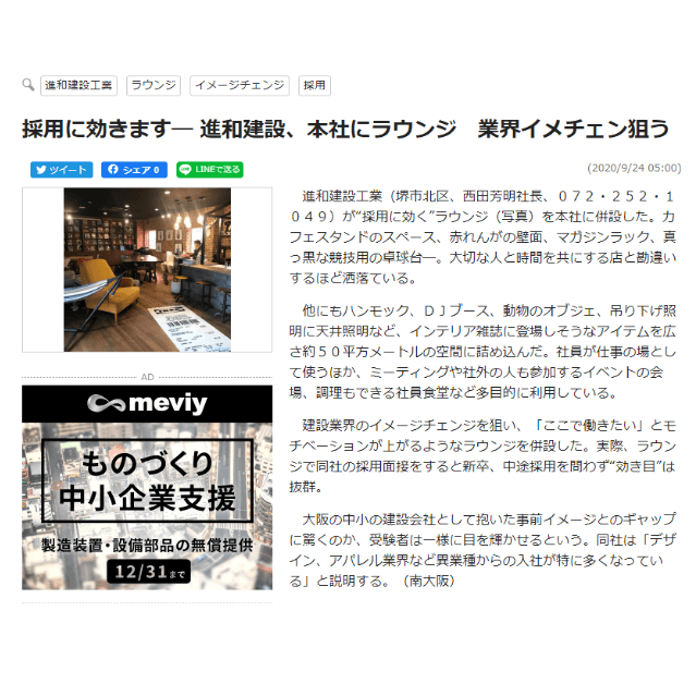 単なるリフォームではなくチームづくりや広報活動の指導までもするから建設現場のブランディングで業界内外から多くの注力を集めている進和建設工業(大阪・堺市)昨年オフィスの刷新に着手し、見事に取材&見学を増やすことに成功。某有名経済団体の視察先にもなり、大型観光バスで大勢の経営者が訪れ、就活生の間で話題にもなっている。