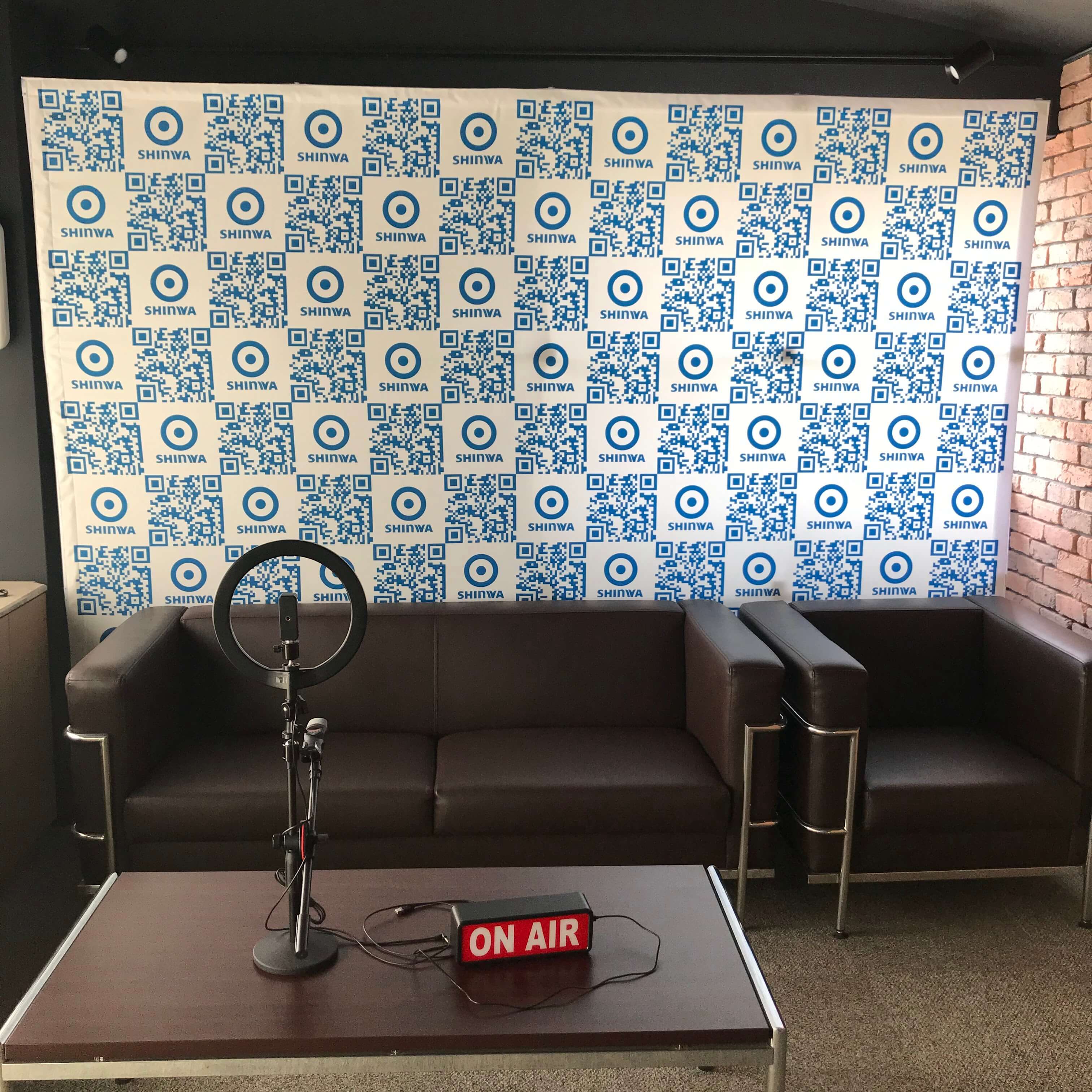 2)4面の壁を全て異なる背景として使えるようにする(今回は、記者会見パネル、赤レンガ、黒、自然光の窓)。